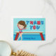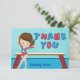 Esta tarjeta postal de agradecimiento para una fiesta de cumpleaños de gimnasia de niñas lindas presenta a una hermosa niña gimnasta morena parada frente a una viga. Lleva un leotardo rojo y sonríe junto a su hermoso monograma azul.