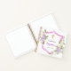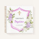 Un fondo blanco. Decorada con un escudo rosa, flores rosadas y violetas, flores. Con una cruz dorada. Personalice y agregue un nombre y una fecha. Se puede usar como libro de invitados o para planificar el evento.