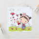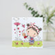 Una bonita escena personalizado con una niña en el jardín natural. La chica tiene el pelo castaño en dos bollos y lleva una banda blanca con puntos rojos de polka, atada alrededor de su cabeza. Ella tiene ojos oscuros, mejillas rosadas y pecas. Su vestido es azul marino con rayas blancas y un corazón rojo en el pecho. Sus zapatos planos también son rojos. Ella sonríe y sostiene una mariquita negra y roja. Ella está parada sobre hierba verde y el cielo es azul claro con un par de pequeñas nubes blancas. En el suelo hay tres hormigas marrones que llevan bayas rosas de las plantas florales que las rodean. Las flores son rosas y amarillas y a su alrededor vuela una flor rosa con puntos negros.