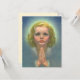 Diseño cristiano de ilustracion vintage con un retrato de un joven chica rubio en oración. Parece un bello ángel con halo o aura y está rodeada de estrellas en el cielo.