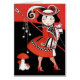 Dibujo negro, rojo y blanco de una niñita mirando sobre su hombro con un abrigo rojo, medias de redes de pesca, tacones altos y un gorra elegante. Dibujo del caricaturista italiano Antonio Rubino para la portada de la revista infantil "Il giornalino della Domenica", 1909.