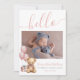 Presentamos un dulce y simple anuncio de nacimiento perfecto para darle la bienvenida al mundo a tu bebé. En la parte superior, un "hola" rosado está elegantemente escrito en tipografía manuscrita, marcando un tono cálido y acogedor. La parte delantera de la tarjeta incluye espacios para fotos de recién nacidos y un oso de peluche lindo con globos rosados, añadiendo un toque lúdico. También puede agregar el nombre, fecha y hora de nacimiento y peso del bebé, o intercambiar estos detalles por otra cosa si lo prefiere. La parte posterior incluye espacio para una nota de agradecimiento personal o detalles sobre su bebé o su embarazo. Este diseño está disponible como tarjeta de impresión o descarga digital, lo que facilita compartir tu alegría con tus seres queridos por correo electrónico. Bebé Cute Niña Recién Nacida Anuncio De Nacimiento De Foto Para Globos Rosa De Recién nacido Guión De Oso De Teddy Hola. Disponible como invitación impresa o como invitación digital descargable que puede enviar por correo electrónico o imprimir localmente.