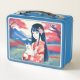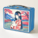 Caja de almuerzo en el ilustracion de un joven chica sereno vestido con traje tradicional japonés, que sostiene un gato blanco en medio de un apacible paisaje, con vibrantes tonos rojos y azul pastel creando un fondo armonioso. La escena cuenta con montañas lejanas, árboles florecientes y un lago.