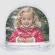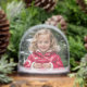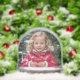 Foto de una niña rubia de pelo rizado con un abrigo y una bolsa rojas para que se caliente la mano con un fondo con árboles de Navidad y nieve blanca cayendo. Mirando directamente a la cámara sonriendo