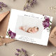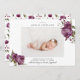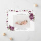 Tarjeta de anuncio de natalidad rústica con una foto de tu recién nacido con un ilustracion acuarela de flores de peonía púrpura con vegetación.
