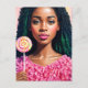 Este artículo presenta un retrato de pintura acrílica de un hermoso chica negro con cabello verde y negro rizado, y ojos de color verde avellano sosteniendo una langosta con un diseño giratorio. La belleza de piel marrón lleva una divertida camiseta rodada rosa y un lápiz de labios rosa. Una obra de arte animada y colorida sobre la temática de los dulces.