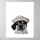 Pug femenino con gorra y abrigo, impresión en color blanco y negro.
