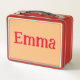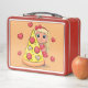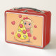 Ilustracion lindo de una niña con vestido rojo. Ella sostiene una rebanada de pizza.