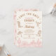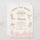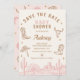 Rústica chica de vaca rosa Baby Shower Salven la tarjeta de fecha dulce chica occidental o la ducha de bebé con temática de vaquera salvan la tarjeta de cita con unas botas de vaquera, desierto rosa occidental, sol, luna y cráneo.