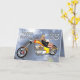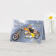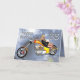 Un chica rubio sobre una motocicleta de helicóptero con estrellas y nubes en el fondo. Una gran tarjeta de cumpleaños para los aficionados a la moto.
