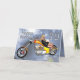 Un chica rubio sobre una motocicleta de helicóptero con estrellas y nubes en el fondo. Una gran tarjeta de cumpleaños para los aficionados a la moto.