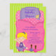 Empieza tu celebración con esta invitación brillante. ¡Es genial para un fiesta que duerme! Tiene un fondo de rayas verde claro. Hay un gran saco de dormir rosa con una almohada morada. Un adorable chica con pijama morado está sentado en la esquina inferior del saco de dormir. Junto a ella hay dos pequeñas botellas de esmalte de uñas: rosa y morado. Revisa los muchos otros diseños y colores de esta línea, así como notas de agradecimiento, etiquetas, camisetas y más.© Ilustraciones JW