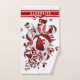 Esta divertida toalla con tema de baloncesto para su mochila de ropa presenta una "explosión" de baloncesto rojo y blanco de tamaño variado y formas estrella rojas y grises sobre un fondo blanco - un patrón de pequeños puntos de polka blanco cubre la estrella roja - personalizar con el monograma del atleta en el baloncesto más grande y nombre en rayas de varsidad rojas de orientación vertical - por katz_d_zynes