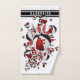 Esta divertida toalla con tema de baloncesto para su bolsa de equipo presenta una "explosión" de baloncesto de tamaño variado rojo, negro y blanco y formas de estrella roja y gris sobre un fondo blanco - un patrón de pequeños puntos de polka blanca cubre la estrella roja - personalizar con el monograma de la atleta en el baloncesto más grande y nombre sobre rayas de barro negras de orientación vertical - por katz_d_zynes