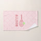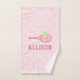 Coral Pink y Lime Green Chica Personalizada y Nombre de la Mujer, Monograma Tennis Design toalla deportiva con un texto audaz y deportivo personalizado con raqueta de tenis e icono de bola en un patrón de red desvanecido.