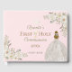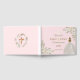 Sorprendente libro de visitas de First Holy Communion con elementos rústicos de inspiración vintage con chica en vestimenta blanca tradicional. En la parte trasera de la invitación hay una cruz de estilo boho con flores acuáticas y vegetación. Personalice sus detalles utilizando la plantilla de texto.