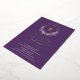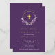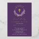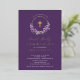 Hermosas invitaciones de Relieve metalizado dorado de la Primera Comunión con una corona de lino lavanda y una cruz de Relieve metalizado dorado sobre un fondo morado profundo. Invierta nuestra invitación para ver una coordinación de nuevo para un toque especial.