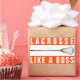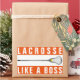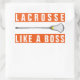 Pegatinas de regalo de Lacrosse, favores de partido y sellos para sobres con la cita de Lacrosse Like a Boss y el diseño de bastón de las mujeres sobre un fondo naranja.