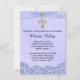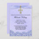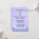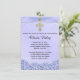 Un bonito diseño elegante con un medallón de cruz colgado de una cinta de satén. El fondo tiene hermosas flores de hidrangea. El fondo es de lavanda violeta con una elegante marca de agua damasca. Personalice esta invitación con los detalles del bautismo o el bautizo de su hijo. Estas invitaciones también funcionan bien para los primeros sindicatos. Por favor, envíeme un mensaje con las personalizaciones que necesite. Arte por Delightful-Doodles.