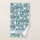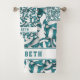 Este único juego de toallas de voleibol tiene un patrón aleatorio de voleibol verde azulado y blanco estilizado, girado en todas partes sobre un fondo blanco personalizable - personalizar la toalla de baño y la toalla de mano con su nombre - por katz_d_zynes
