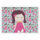 Diseño lindo, divertido, caprichoso y colorido sobre artículos como carteras, relojes, tarjetas, pegatinas, bolsas de cuerda floja, espejos compactos, cadenas de claves, cuadernos, franqueo, encuadernadores, almohadas, y mucho más, presenta a niñas pequeñas con vestidos rosados de corazón, bolsos punteados de polka rosa y blanco, estrellas moradas oscuras y un fondo de rayas azules.