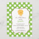 Invitación a Baby Shower de Sweet Easter Chick con una linda chica puesta sobre un fondo de polka verde y blanco. Disponible para chicas, chicos y mellizos en nuestra tienda. Los productos de concordancia también están disponibles en nuestra tienda www.celebrateitinvites.com. ©Zenware