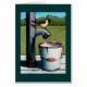 Pintura en colores pastel de un pequeño chickadee en una bomba vieja oxidada, mirando en un cubo blanco viejo del esmalte.
