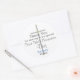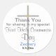 Elegante Gracias Primero Santa Comunión, hijo de pegatinas redondos. Sencilla cruz de plata pintada a mano con acentos dorados sobre fondo blanco. Personalice el nombre de su hijo en texto azul y la fecha en texto negro. Arte Gráfico original y diseño © TamiraZDesigns.