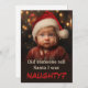 ¡Te descubrieron! ¿Quién te delató? Intentaste ser amable y casi lo logras. ¡Pero estás en la lista de traviesos de Santa de nuevo! No estás en la lista de niños buenos de este año. Esperamos que disfrutes de esta divertida tarjeta de Navidad. Puedes dejar la foto del niño con el sombrero de Santa si lo deseas, o puedes reemplazarla con tu propia imagen. Todo el texto es editable. Asegúrate de cambiar el nombre del ejemplo "de" (Jerry) y el año a los que desees. Además, cualquier texto en el reverso de la tarjeta se puede cambiar.