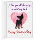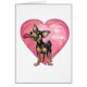 Desfile de Animales Romántico Chihuahua Perro Mío Tarjeta del Día de San Valentín presenta nuestro divertido arte de un Chihuahua negro y marrón que sostiene una hermosa rosa en su boca con corazones apilados de color púrpura, rojo y rosa detrás, pintado digitalmente por nuestra talentosa artista infantil, Traci Van Wagoner. Este dulce diseño de perro enamorado es un regalo perfecto para el día de San Valentín, su cumpleaños, para proponer matrimonio de una manera divertida y original, o simplemente para decir, te amo. ¡Guau!