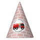 Un fiesta gorra de cumpleaños infantil con un ilustracion de un camión de bomberos rojo y un fondo inspirado en ladrillos. Personalice el nombre en el frente.