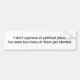Pegatina para el parachoques con la declaración "que no apruebo de chistes políticos. He visto demasiados de ellos conseguir elegidos."
