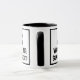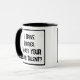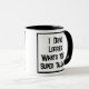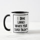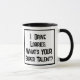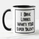 Divertido lema en una taza que dice "Conduzco camiones. ¿Cuál es tu supertalento?". Dos tazas para un camionero. Texto en negrita en blanco y negro.