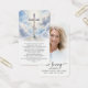 This memorial prayer card features a Christian cross with a radiant sky and cloud background, symbolizing faith, hope and eternal peace. The opposite side highlights a personalized photo alongside the phrase “In Loving Memory,” creating a heartfelt tribute for funeral services, memorial gatherings or a celebration of life. Included is an editable "The Lord’s Prayer," offering familiar words of comfort and reflection for family and friends during moments of remembrance (or change to another prayer, bible verse, poem or custom remembrance message). Its small and portable size (3.5x2") makes this keepsake card convenient to carry as a reminder of their life and spirit. Personalization makes these cards unique.