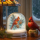 Create lasting memories with this Christmas cardinals winter snow globe. The artwork features a digital watercolor illustration of a pair of red cardinals perched on a fir tree branch with pine cones. An overlay of snowflakes adds to the winter design. Anyone who loves songbirds will appreciate this snow globe as a gift to enjoy throughout the winter months. This snow globe would be a thoughtful gift for coworkers, teachers, neighbors, and grandparents. AI watercolor image designed by Susang6.