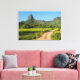 Paisaje de lienzo impreso en una bicicleta turística femenina en un camino de tierra con la montaña Rotui en el fondo de la isla tropical de Moorea, cerca de Tahití, en la Polinesia Francesa.