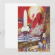 Ilustración vintage de ciencia ficción que presenta mujeres alienígenas mirando una ciudad futurista con una fuente de agua en el centro, alienígenas con lagartos como mascotas, arquitectura de tipo griego o romano y una luna enorme en el fondo. ¡Podría ser la ciudad perdida de Atlántida! Una clásica escena retro de ciencia ficción futurista de cómics de los 50!