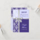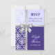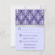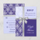 © Socialite Designs. Tarjeta de respuesta de elegante invitación de boda para una boda de verano u otoño que incorpora damasco blanco, una cinta plateada con lazo impresa y dos colores de fondo de lavanda y púrpura. Por favor, póngase en contacto con Socialite Designs si desea una combinación de colores diferente, ayuda con la personalización u otros productos de boda creados con este diseño. Tenga en cuenta que la cinta es una imagen y está impresa en la invitación.