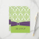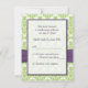 Esta tarjeta de respuesta de damasco verde lima y lapislázuli púrpura coincide con la invitación de boda que se muestra a continuación.