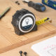 Diseño de bombilla azul, medida de cinta electrónica por la tienda de tarjetas de visita.