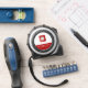 Dos clavijas de alimentación, medida de la cinta de los electrostáticos por parte de la tienda de tarjetas de visita.