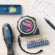 Alarma rosa, morada y dorada sobre el diseño de patrones de fondo azul.