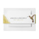Un diseño refinado inspirado en la naturaleza que presenta un colibrí verde flotante combinado con suaves acentos de polvo de oro. La elegante disposición y la paleta terrosa la hacen ideal para bodas al aire libre, de jardín o de verano.