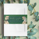 Invitación de boda de dinosaurio divertido con banda ventral. Tipografía elegante personalizada con guión de novia y novio T-Rex con vegetación de eucalipto en acuarela sobre un fondo verde oscuro rico.
