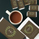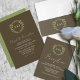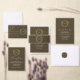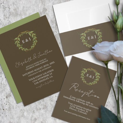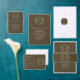 Wedding collection with earth tones of green and dark brown. A gold geometric monogram crest surrounded by botanical leaves.