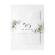 El diseño presenta un ramo de vegetación acuática, eucalipto y suculentos tonos azules y verdes. El diseño también presenta un elegante monograma. El color de fondo está definido en blanco para complementar el conjunto de invitaciones coincidentes. Vea el enlace de la colección en esta página para ver todos los elementos coincidentes de este hermoso diseño.
