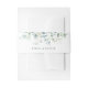 Esta banda de invitación a la boda incluye eucalipto de acuarela pintado, hojas botánicas verdes y hojas azul claro.