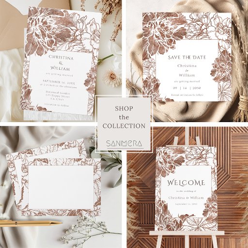 Esta elegante banda de invitación a la boda presenta un diseño floral minimalista con ilustraciones botánicos hechos a mano en una paleta rústica de color marrón mocha. Las delicadas flores de arte en línea, combinadas con un diseño limpio y moderno, añaden una estética sofisticada y atemporal, perfecta para los bodas modernos o para los bodas de moda boho.