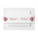 Bonita exposición artística burdeos y acuarelas blancas, esta banda de invitación al vientre se sitúa sobre un fondo blanco, con el nombre de la pareja centrado en una bonita letra borgoña cursiva. A cada lado del texto hay hermosas flores de Borgoña. Utilizando plantillas fáciles de personalizar, personaliza hoy tus bandas de invitación a la boda.