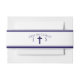 El diseño presenta las iniciales de la novia y el novio en una impresión azul marino. La imagen de una cruz se encuentra entre las iniciales. La frase personalizable, "Uno en Cristo" se muestra arriba en forma de arco. El diseño está enmarcado por elegantes bordes azules y blancos. Diseñado para coordinar con la Suite de Boda Monograma Católica Atemporal.